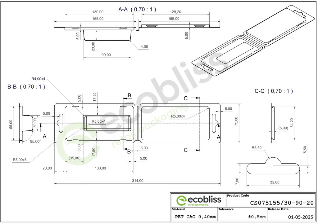 Whether you're packaging electronics, cosmetics, tools or other products, these clamshell blisters offer a combination of visibility, durability and easy handling and is made from sturdy, fully recyclable PET.