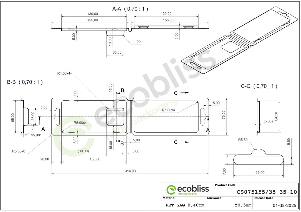 Whether you're packaging electronics, cosmetics, tools or other products, these clamshell blisters offer a combination of visibility, durability and easy handling and is made from sturdy, fully recyclable PET.