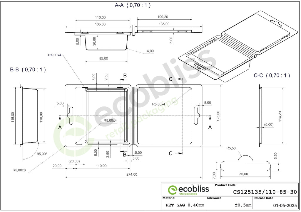 Whether you're packaging electronics, cosmetics, tools or other products, these clamshell blisters offer a combination of visibility, durability and easy handling and is made from sturdy, fully recyclable PET.