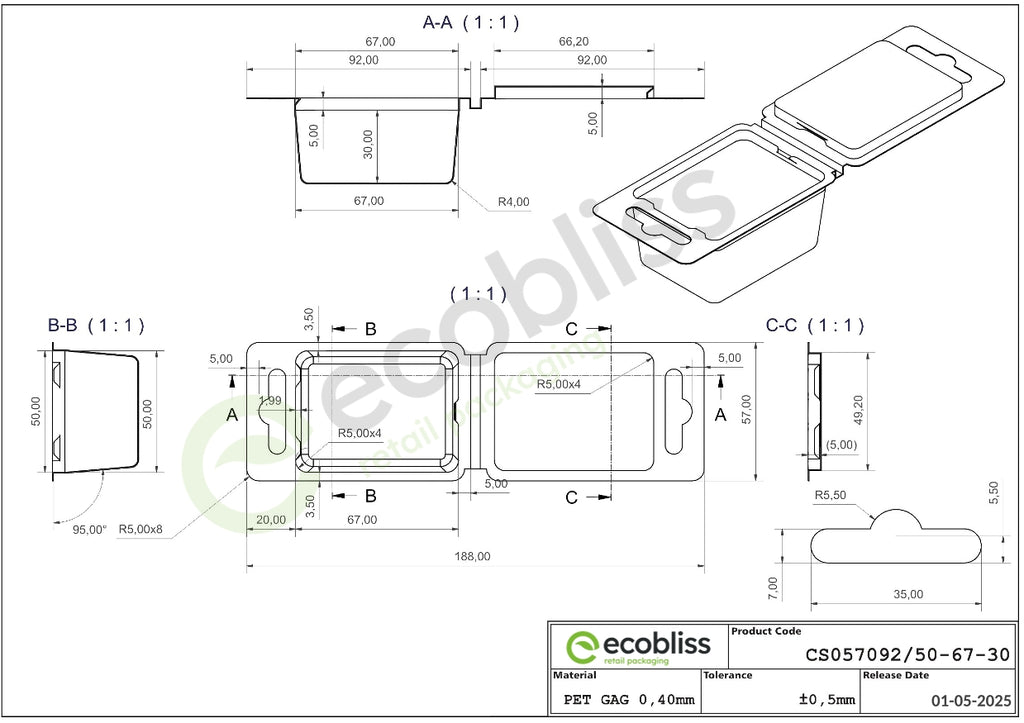 Whether you're packaging electronics, cosmetics, tools or other products, these clamshell blisters offer a combination of visibility, durability and easy handling and is made from sturdy, fully recyclable PET.